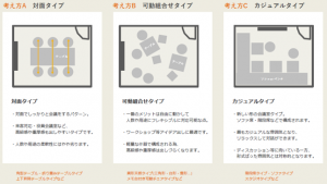 ③リラックスした会話を促すカジュアルタイプなど、